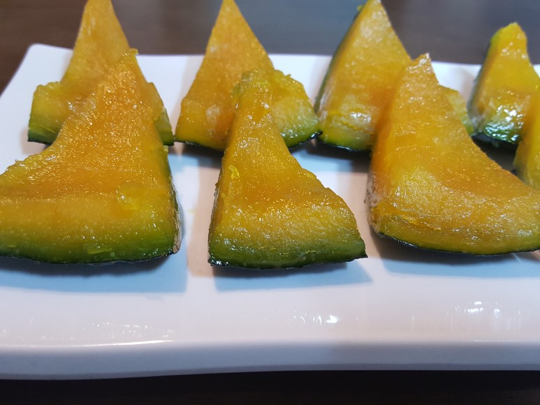 After about 10 minutes, remove the lid. You’ll see that the pumpkin pieces are beautifully glazed and the sauce has thickened nicely. Your delicious braised pumpkin is now ready! It tastes wonderful warm, but it’s also great served chilled. Enjoy it as a side dish with rice or as a sweet snack.