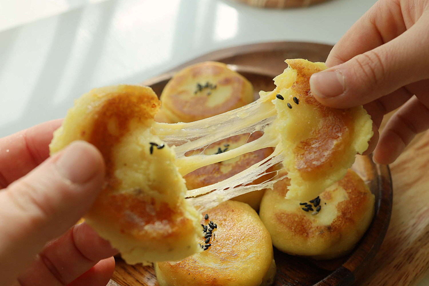 Once you have formed the sweet potato dough, heat a pan with oil over medium heat. Pan-fry the dough balls on both sides until golden brown and slightly crispy. This step ensures a nice crispiness on the outside while the cheese inside melts, making it even more delicious. (Note: This step can be combined with the caramel sauce step if preferred).