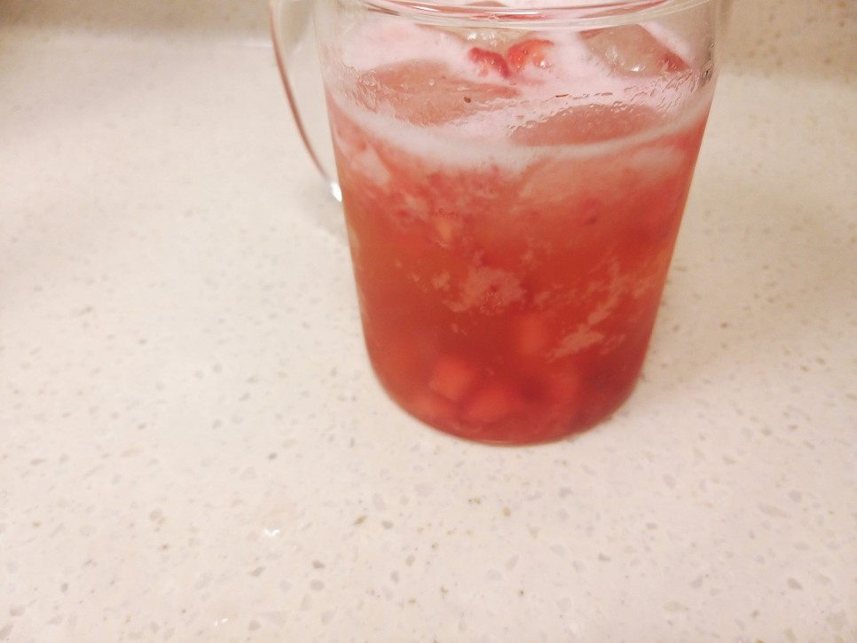 The subtle fruity aroma from the kiwi sparkling water beautifully complements the rich sweetness of the strawberry syrup, creating a delightful symphony of flavors. You’ll notice a hint of kiwi alongside the vibrant, fresh strawberry essence that fills your mouth. Give it a gentle stir to combine everything, and your exquisite strawberry ade is ready to be enjoyed. Cheers!