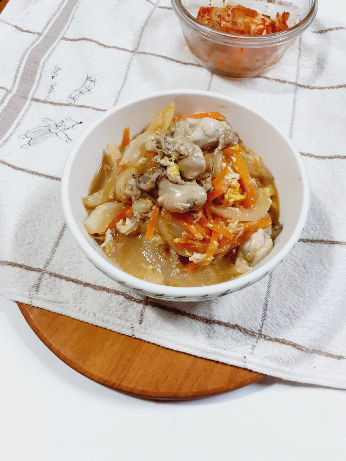 Finally, crack one egg into the pan. Gently whisk the egg into the mixture, allowing it to cook through and bind the ingredients. Once the egg is set, turn off the heat. Serve the oyster and vegetable mixture generously over a bowl of warm cooked rice.