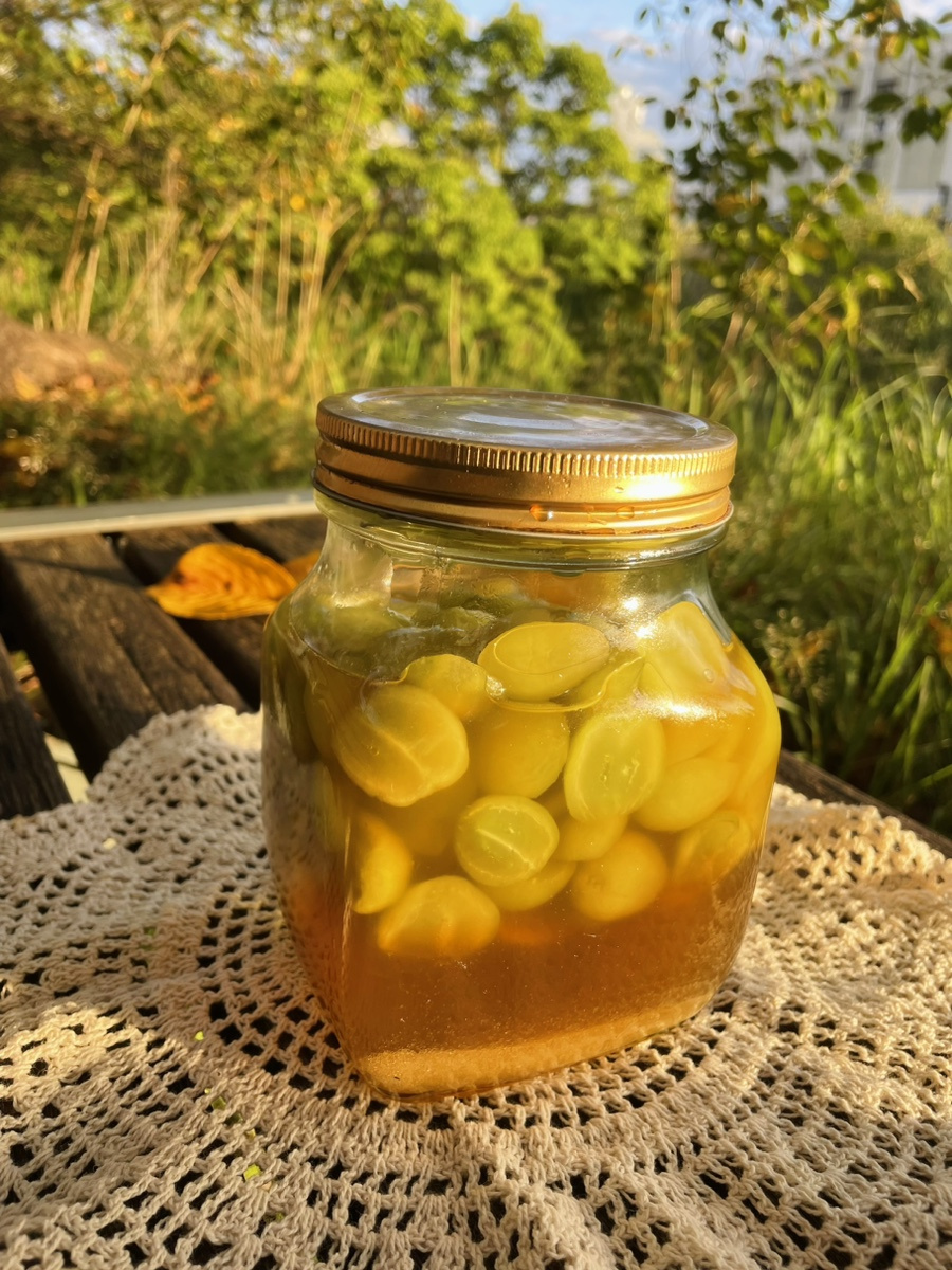 Continue layering the peeled grapes and sugar until the jar is nearly full. Finish by covering the top layer of grapes with the remaining sugar. Since Shine Muscat grapes are naturally sweet, you can reduce the sugar to about half the amount of grapes, rather than a 1:1 ratio. Adjust the sugar quantity to your preference.