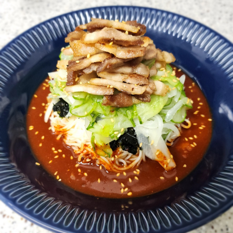 Introducing a refreshingly sweet and tangy bibim guksu, perfect for combating the hot and humid summer days! Crispy, pickled cucumbers and onions create a fantastic harmony, elevated by Chef Ryu Soo-young’s signature spicy gochujang sauce. This recipe is for a single serving, making it easy to prepare a satisfying meal for yourself. Enjoy a wonderful dining experience!