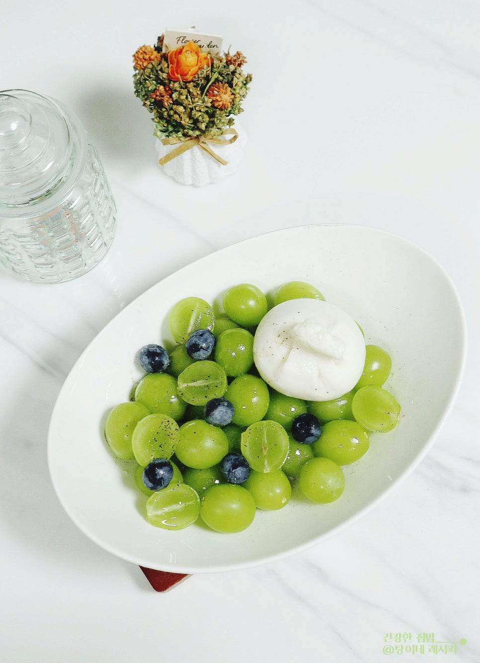 Arrange the drained Shine Muscat grapes attractively on your serving plate. Sprinkle a handful of frozen blueberries over the grapes for a touch of color and fruity flavor. Finally, gently place the fresh Burrata cheese ball in the center of the salad, completing its beautiful presentation.