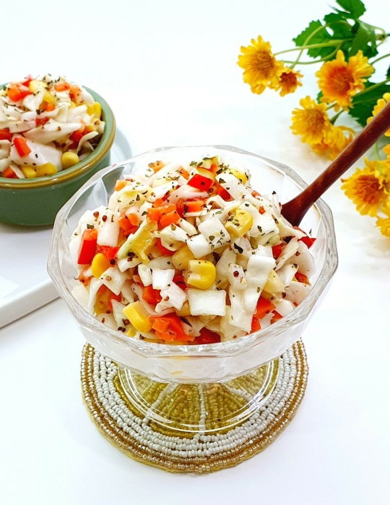 In a large bowl, combine the drained cabbage, julienned vegetables, and canned corn. Add all the dressing ingredients (sugar, vinegar, lemon juice, mayonnaise, salt, whole grain mustard, and pepper). Add the salt in two installments, tasting as you go, or adjust the amount to your preference if you prefer a milder flavor.