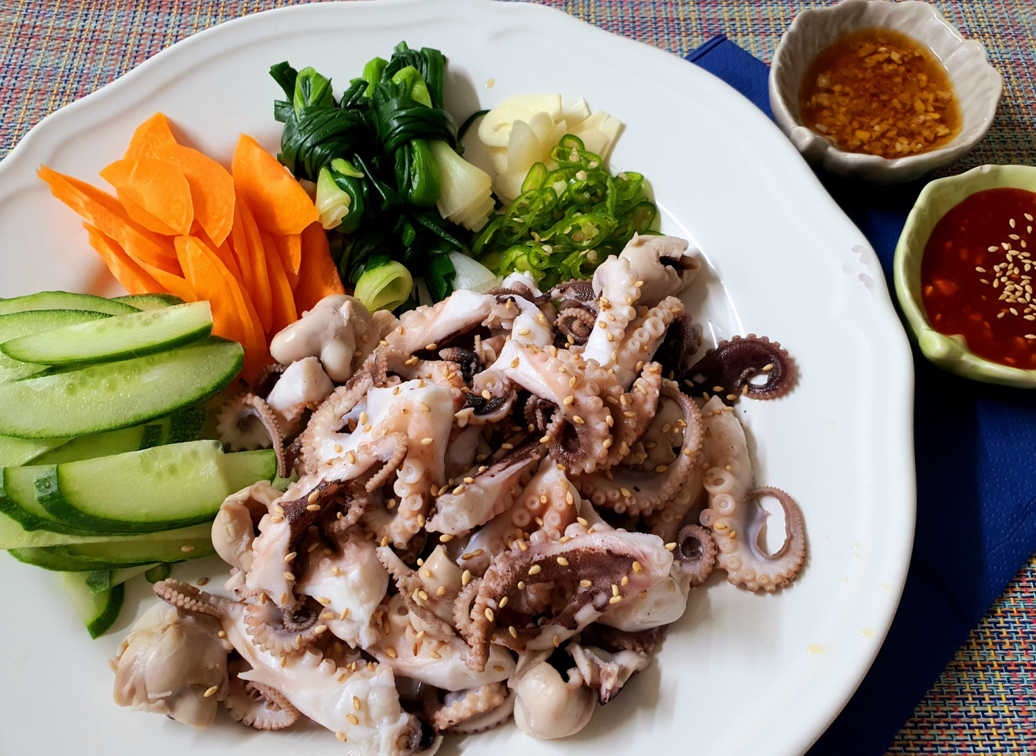 Arrange the sliced baby octopus, cucumber, carrot, and rolled scallions attractively on a serving plate. If you like, finely chop the chili pepper and add it for color and a spicy kick. I also added some sliced whole garlic cloves as I enjoy garlic. Dip the octopus and vegetables into your preferred sauce – either the gochujang or sesame oil dip – and enjoy!