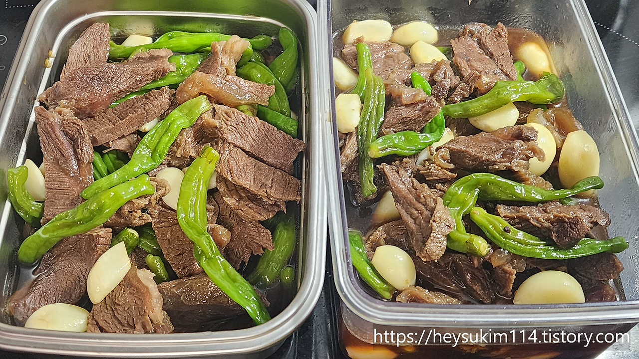 Wash the Korean green chili peppers and remove their stems. Peel the whole garlic cloves. You can make a small slit in the chili peppers to help them absorb the sauce better.