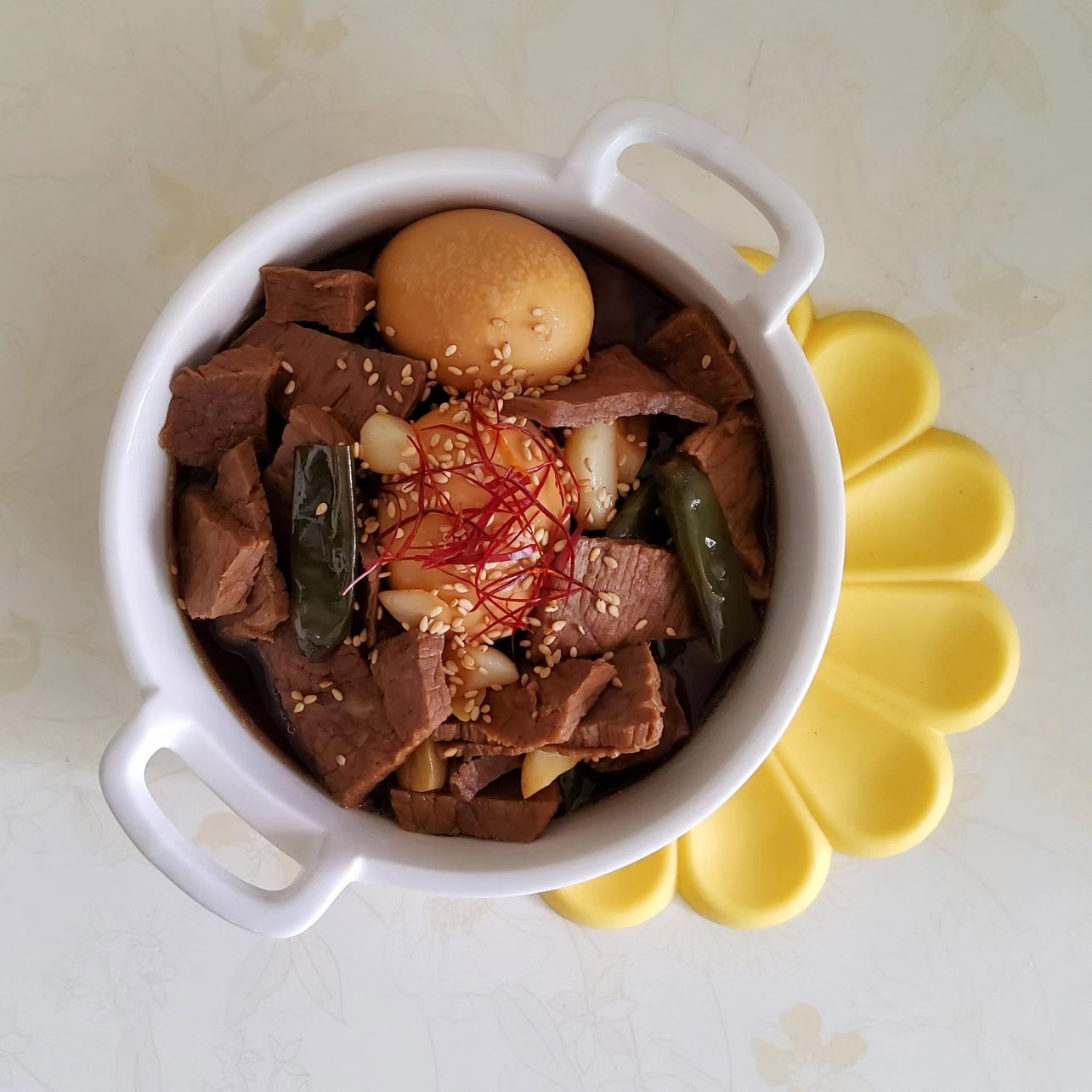 Return the thinly sliced beef and eggs to the pot with the soy sauce mixture. Continue to simmer over medium-low heat for another 10 minutes. This step allows the sauce to fully infuse into the meat and eggs. Finally, turn off the heat, sprinkle with sesame seeds and shredded chili peppers, and your delicious Beef Shank Jangjorim is complete!