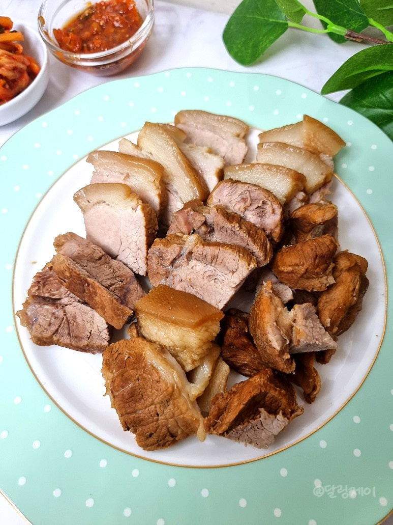 [Boiled Pork Belly (Bossam)] Begin by soaking the pork in cold water for about 30 minutes to remove any excess blood. For bossam, cuts like Boston butt, pork belly, or ogyeopsal are recommended as their fat content ensures a tender and flavorful result.