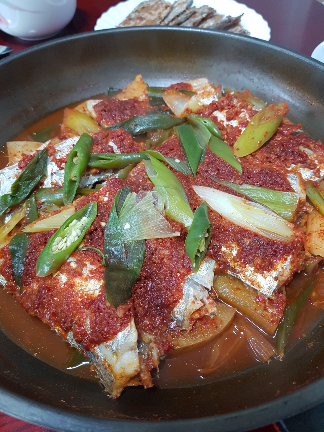 Arrange the sliced green onion and Korean green chilies on top of the fish. Check the liquid level and add more water (using anchovy-kelp broth will add deeper flavor) if needed. Cover the pot and simmer over medium-low heat for about 10-15 minutes, or until the fish is fully cooked. Keep an eye on the liquid level occasionally to prevent it from drying out. Reducing the sauce further will result in a more concentrated flavor.