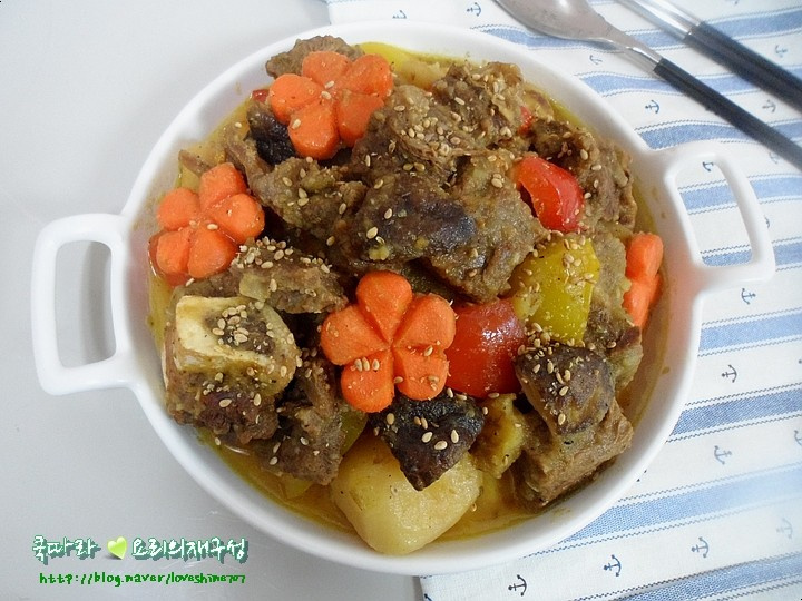 Once the pressure has been released from the pressure cooker, carefully open the lid. Add the sliced bell peppers and decorative carrots. Gently stir everything together, allowing the residual heat to cook the vegetables slightly. Your delicious Korean Beef Galbi Jjim is now complete! Serve immediately while warm for the best flavor experience.