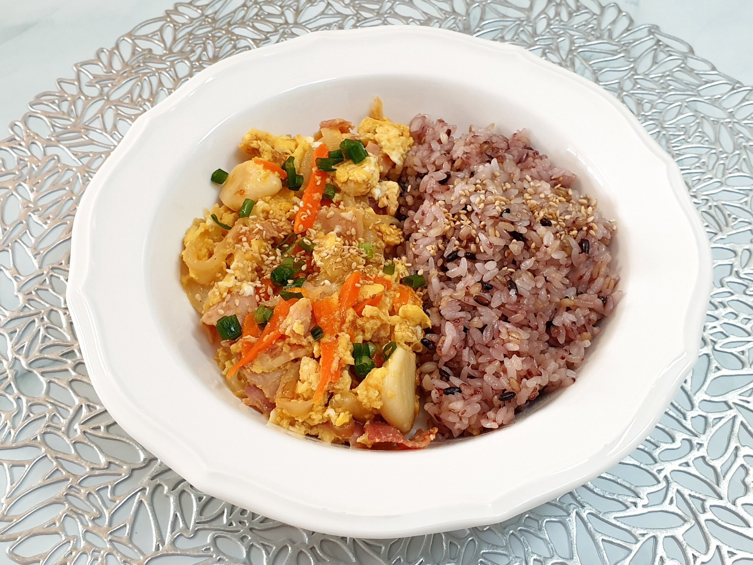 Serve the cooked Spam and egg mixture over a bowl of hot rice. Garnish with chopped green onions and sesame seeds to complete your delicious Spam and Egg Rice Bowl! Even picky eaters who dislike vegetables will enjoy this preparation. The pan-fried whole garlic cloves are also a tasty treat, so don’t miss them!