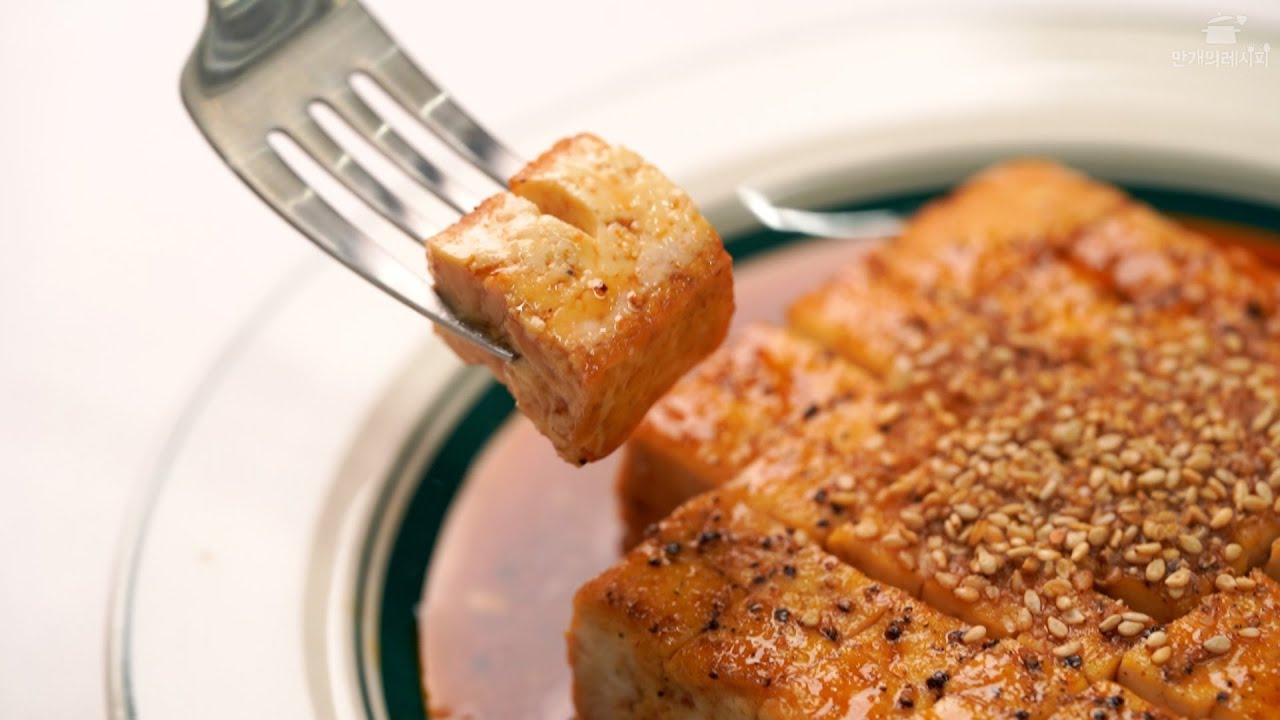 Preheat a pan and add a small amount of olive oil. Place the seasoned tofu in the pan and sear both sides until golden brown. Cook slowly over medium-low heat until the surface is a beautiful golden brown.