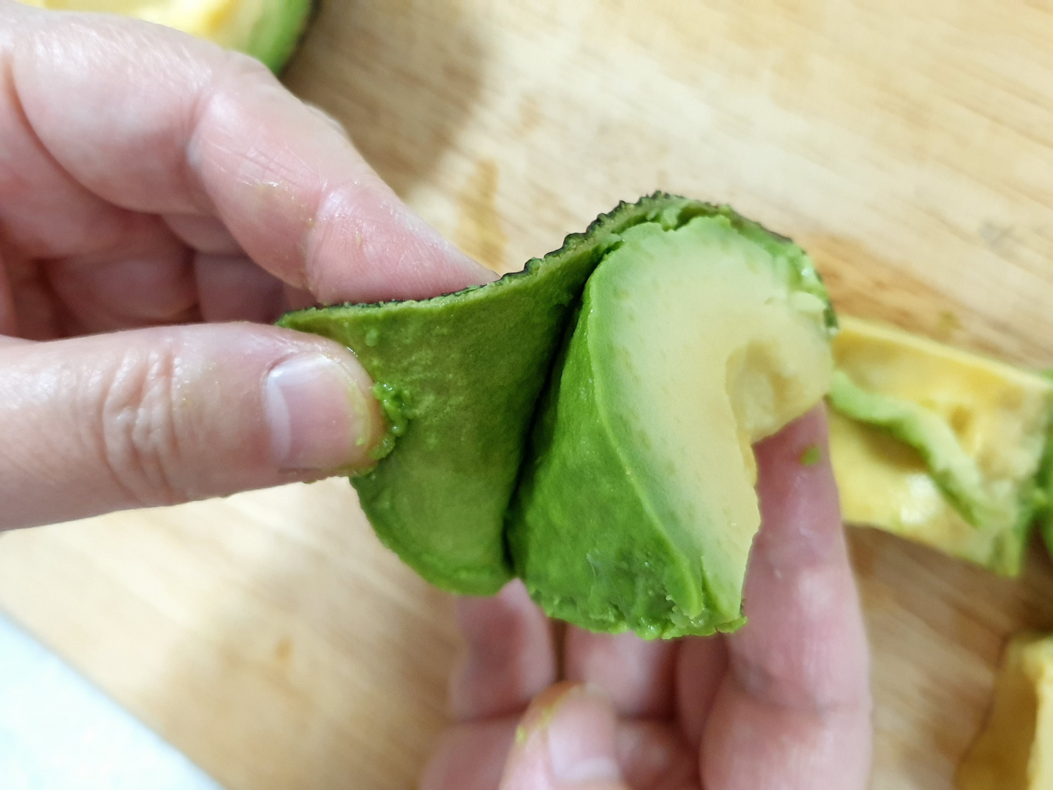 Now, cut the avocado flesh into your desired size. You can dice it into cubes for salads, slice it for toast, or scoop it out with a spoon. You can peel the avocado first and then cut, or cut it directly in its skin and then scoop out the pieces with a spoon for added convenience.