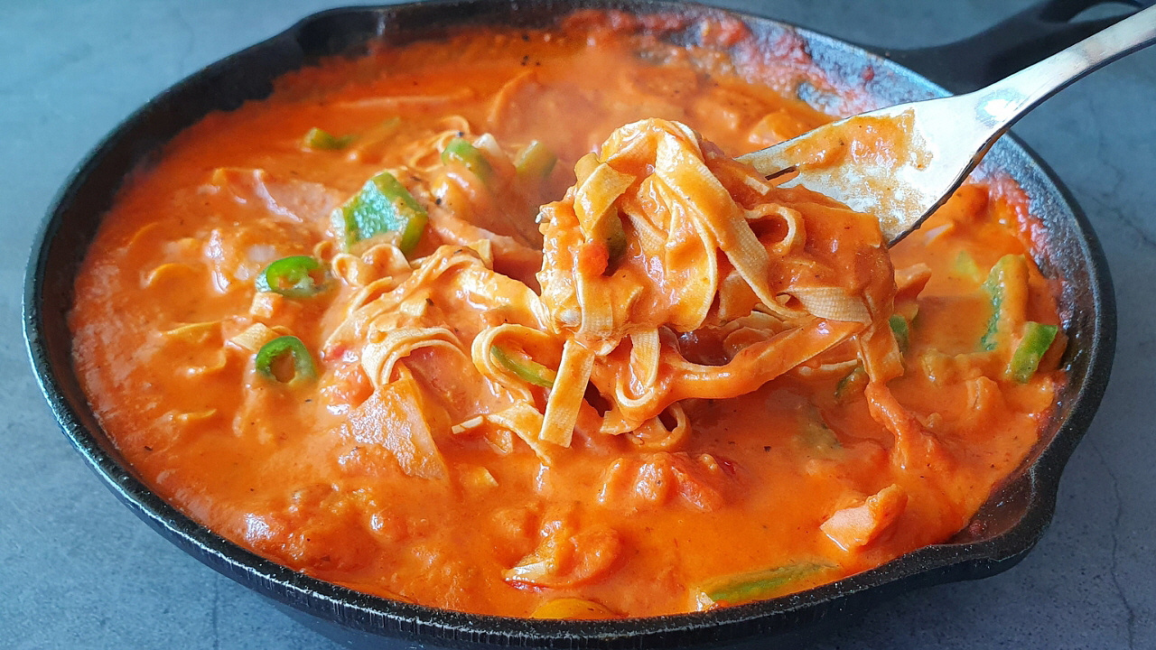 Add the prepared bell pepper to the sauce and bring it back to a simmer. Then, add the drained tofu noodles to the pan. Gently toss everything together to coat the noodles evenly with the sauce. Cook for about 1 minute more. Season with a pinch of black pepper. Your delicious and creamy Tofu Noodle Rosé Pasta is ready to be enjoyed!