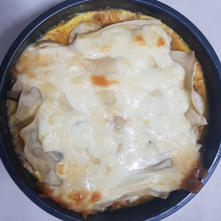 Spread the cooked pork and tomato sauce mixture evenly over the tofu layer. The tangy and sweet sauce will enrich the overall flavor of the lasagna.