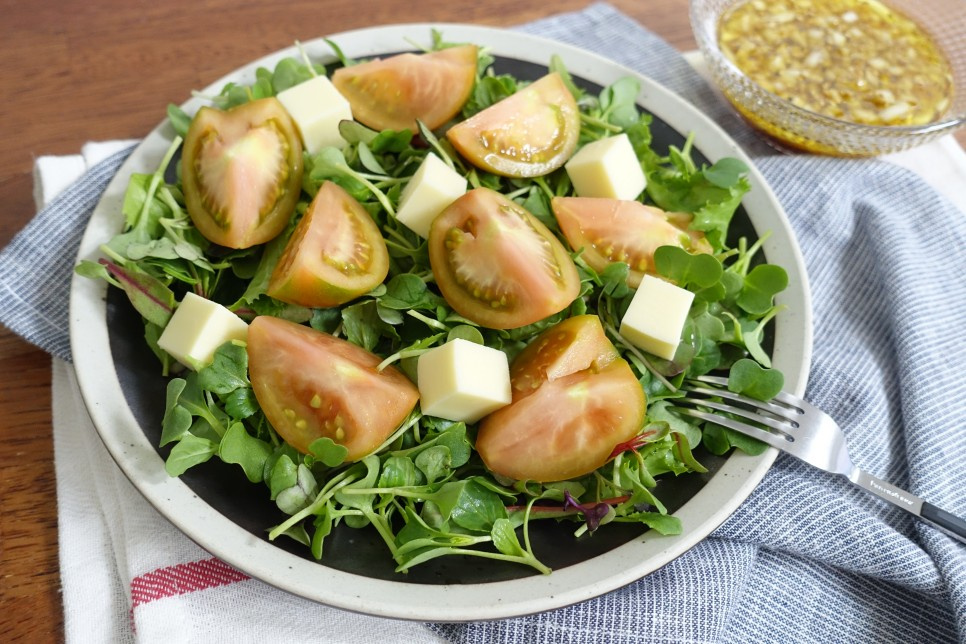 This recipe features fresh, slightly salty ‘jjapjjari’ tomatoes, creamy cheese, and crisp salad greens, all brought together with a vibrant, homemade oriental dressing. It creates a sophisticated and satisfying salad dish that’s perfect for any occasion.