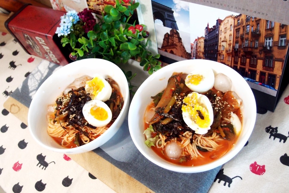 Place the halved soft-boiled eggs on top of the bibim-myeon for added richness. For an extra layer of savory flavor, sprinkle with finely shredded roasted seaweed (gim). It’s best to use plain roasted seaweed rather than seasoned varieties to allow the kimchi flavors to shine.