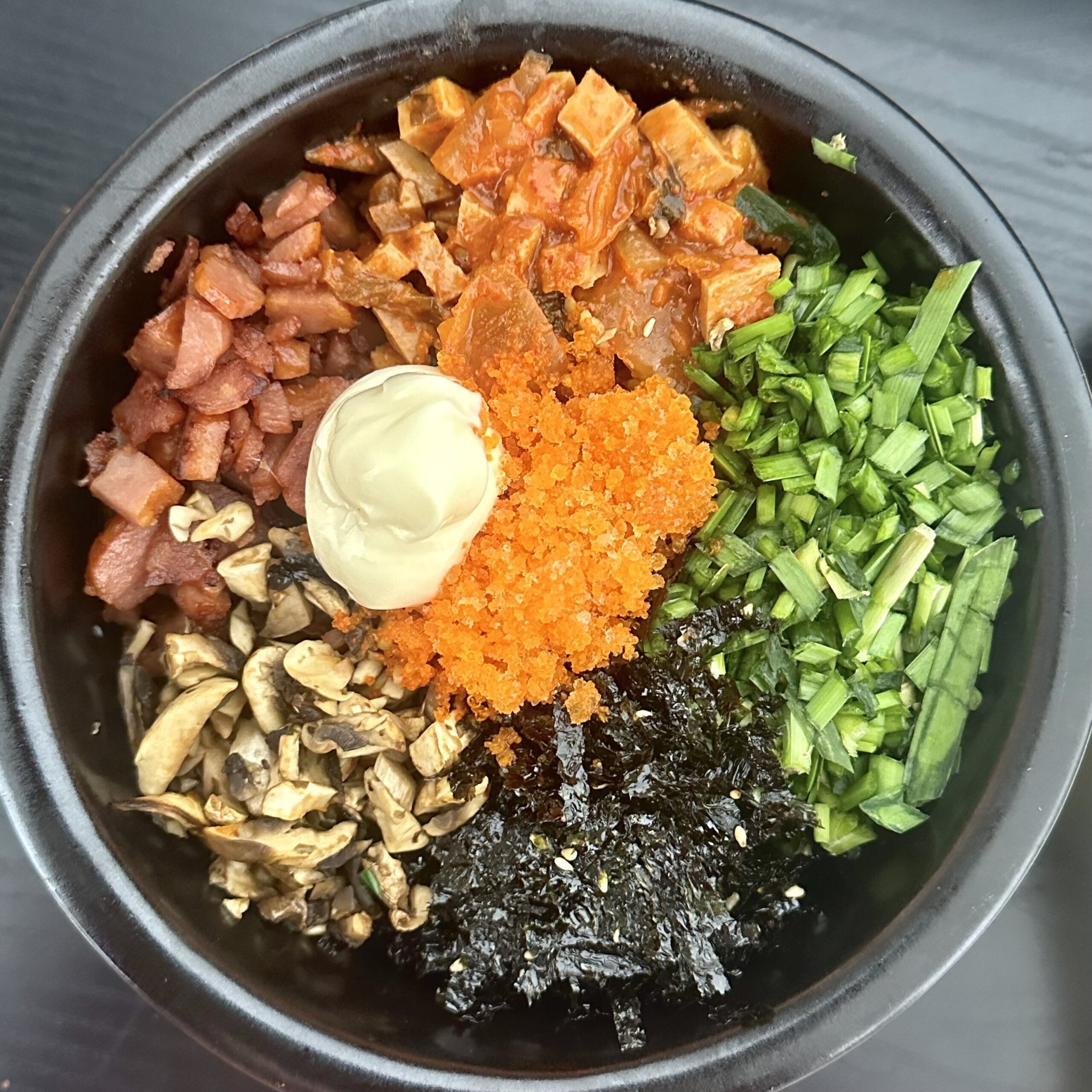 Dispón los ingredientes preparados de forma atractiva sobre el arroz. Coloca ordenadamente los champiñones salteados, el jamón a la plancha, el kimchi salteado, los cebollinos picados y las algas desmenuzadas alrededor del arroz. Intenta crear una disposición visualmente atractiva con los diferentes colores y texturas.