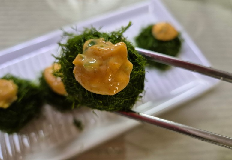Me inspiré en la Chef Lee Jung-hyun del programa de televisión ‘Pyeonstaurant’, quien preparó bocadillos para el director y sus colegas antes de un estreno de cine. Como gran fan de su cocina confiable, ¡inmediatamente encendí mi laptop y empecé a tomar notas! Ese día, la Chef Lee preparó una deliciosa variedad que incluía bolitas de arroz con gamtae, mini pizzas de champiñones, huevos al vapor de calabaza dulce, brochetas de camarones y cebolleta, y mochi de frutas. Con la oportunidad de disfrutar una comida en solitario, decidí probar primero el plato más sencillo pero intrigante: ¡las bolitas de arroz con gamtae! Son increíblemente fáciles de hacer para cualquiera, pero la idea detrás de ellas es realmente brillante.