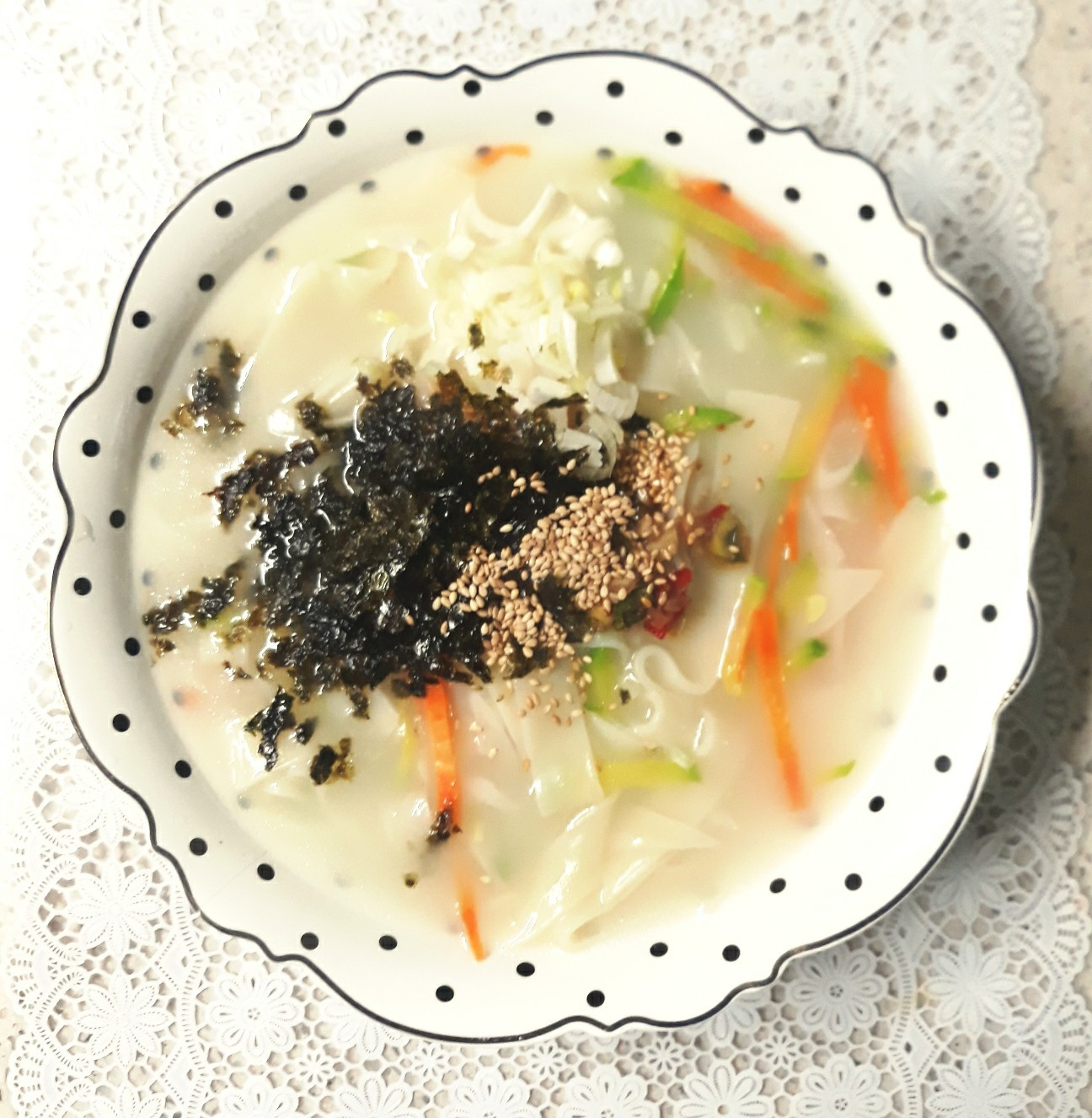 Sirve el kal-guksu terminado en cuencos. Cubre con una cucharada de salsa de soja sazonada (si la usas), una pizca de copos de alga seca para un toque sabroso y semillas de sésamo tostadas para dar sabor a nuez y un atractivo visual. ¡Disfrútalo mientras esté caliente!