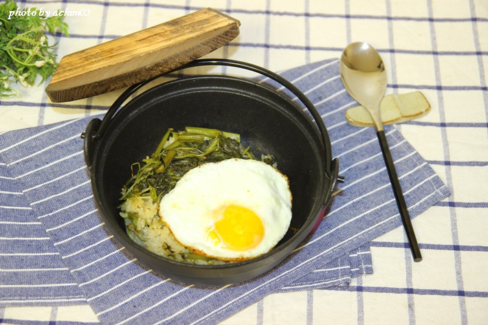 Transfiere el arroz de Chwinamul terminado a una olla de hierro fundido precalentada o a un cuenco normal para servir, para una presentación atractiva. Coloca suavemente el huevo frito recién hecho encima. Según tu preferencia, puedes mezclarlo con gochujang (pasta de chile coreana) o salsa de dallae (salsa de cebollino silvestre coreano) para una experiencia de arroz de Chwinamul aún más rica y sabrosa.