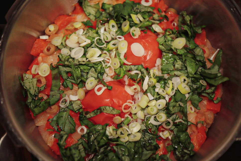 A continuación, prepararemos las verduras. Corte finamente las cebolletas o puerros. Pique finamente 2 de los tomates para incorporarlos al arroz. Para los 2 tomates restantes, retire los tallos y haga una incisión en forma de cruz en la parte inferior de cada uno. Esto ayudará a que se abran maravillosamente mientras se cocinan.
