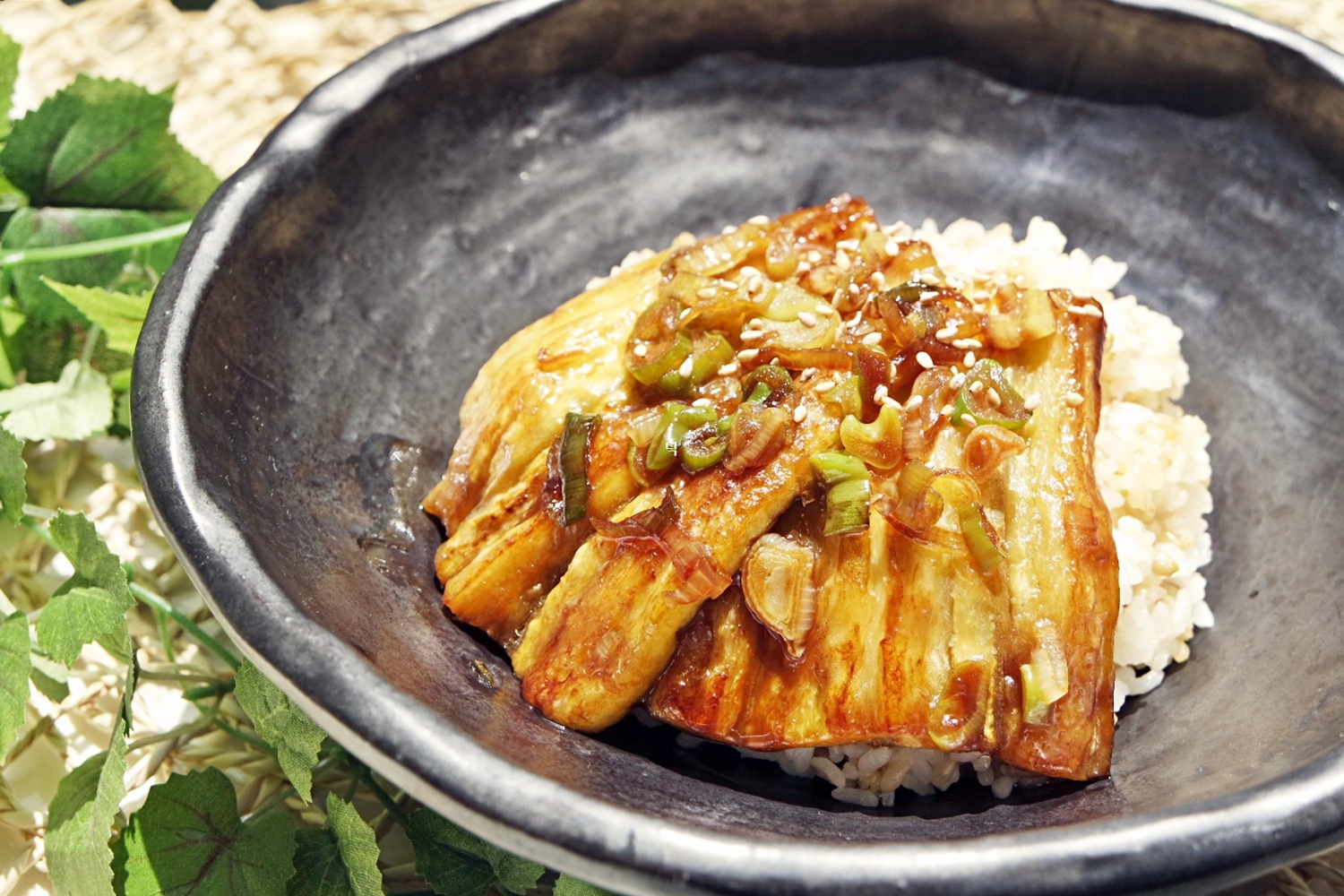 Monta tu plato de arroz colocando una generosa porción de arroz caliente en un bol amplio. Coloca encima la berenjena dorada y con salsa. Rocía con 1/2 cucharada de aceite de sésamo para un toque final. ¡Disfruta de tu delicioso plato de arroz con berenjena!