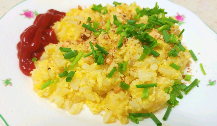 Para un toque dulce y divertido, especialmente para los niños, rocía un poco de kétchup en forma circular o la figura que prefieras sobre el arroz con huevo.