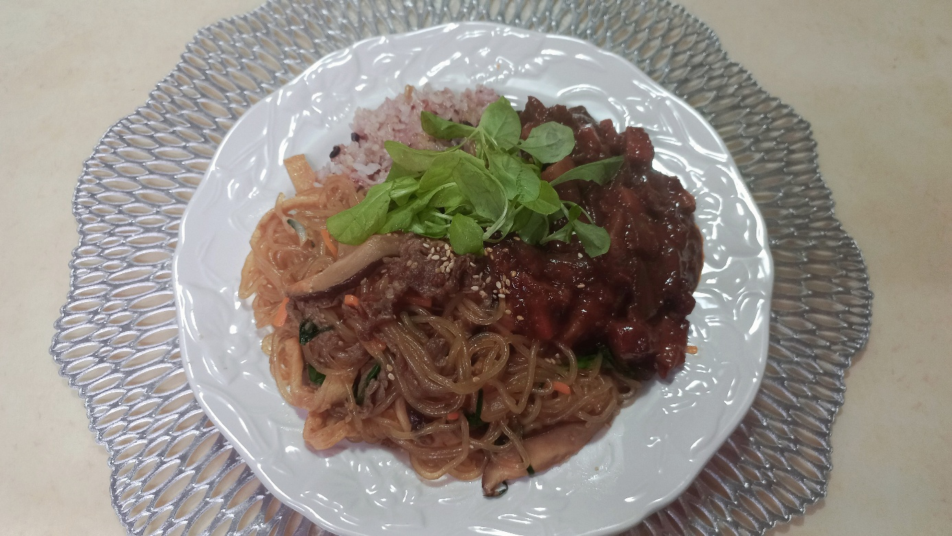 Arroz con Jjapchae y Salsa Jjajang (Fácil y Rápido)