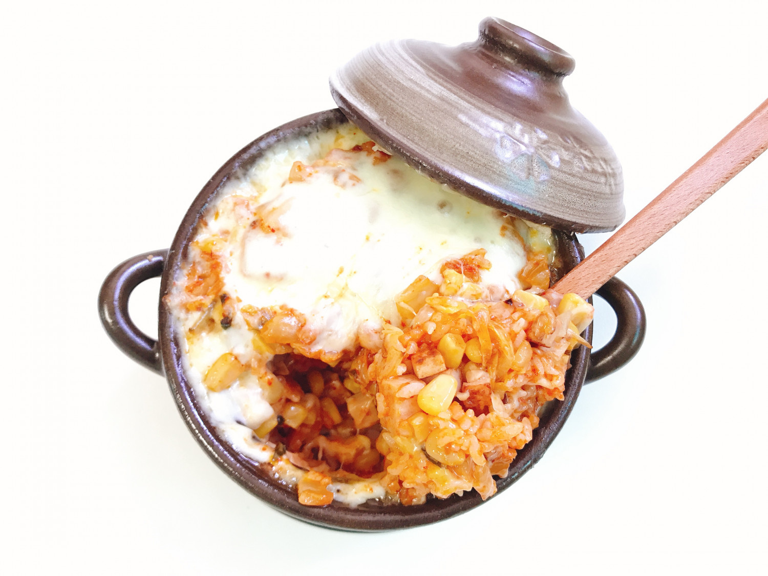 Al tomar una cucharada, ¡el queso se estira lujosamente! El arroz está lleno de jamón salteado, cebolla, kimchi y maíz, ¡haciendo que cada bocado sea increíblemente satisfactorio y sabroso!