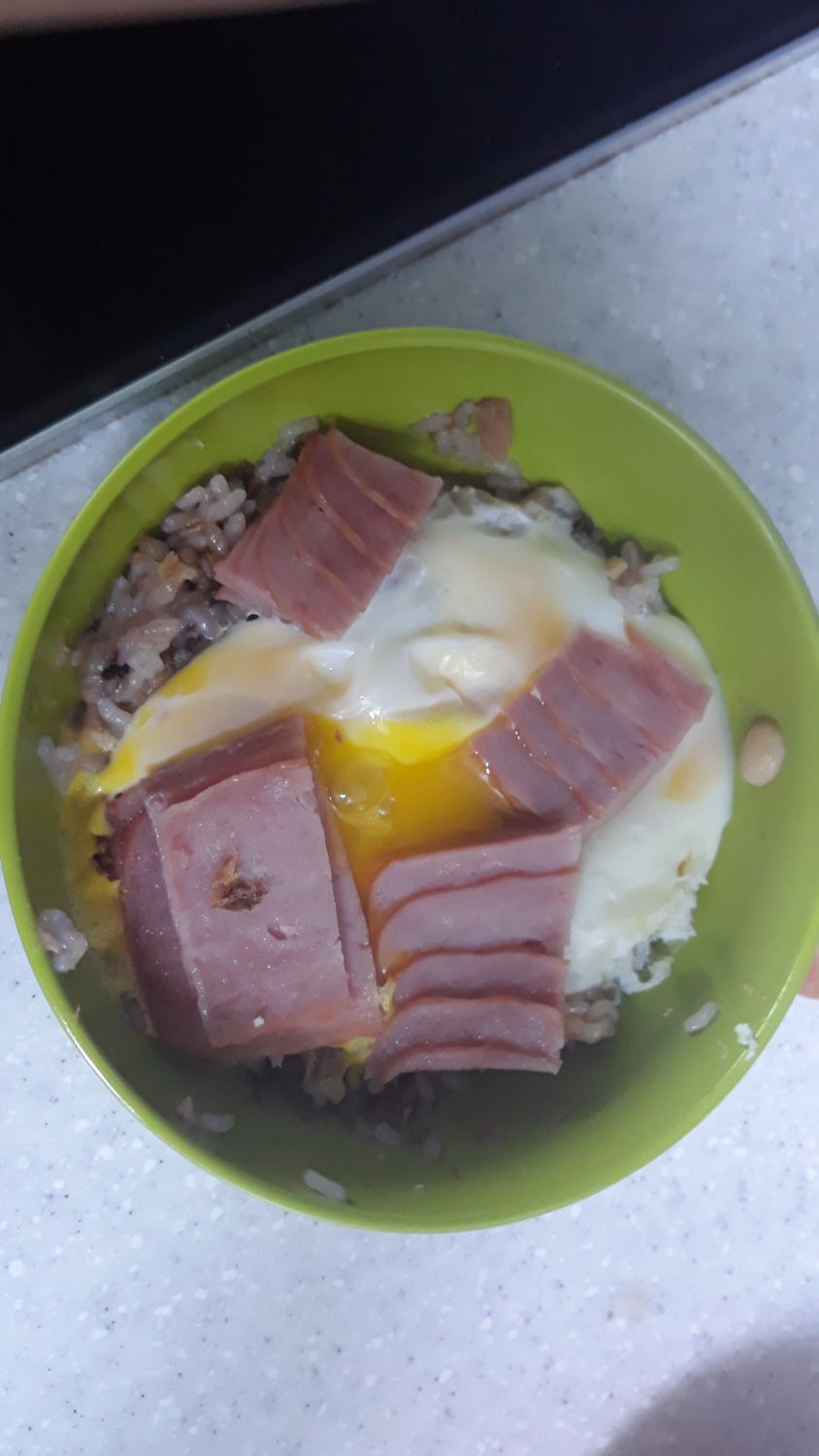 Coloca las lonchas de jamón o mortadela cortadas encima del huevo y el arroz. La carne se cocinará y se mezclará con el arroz, añadiendo un delicioso toque salado.