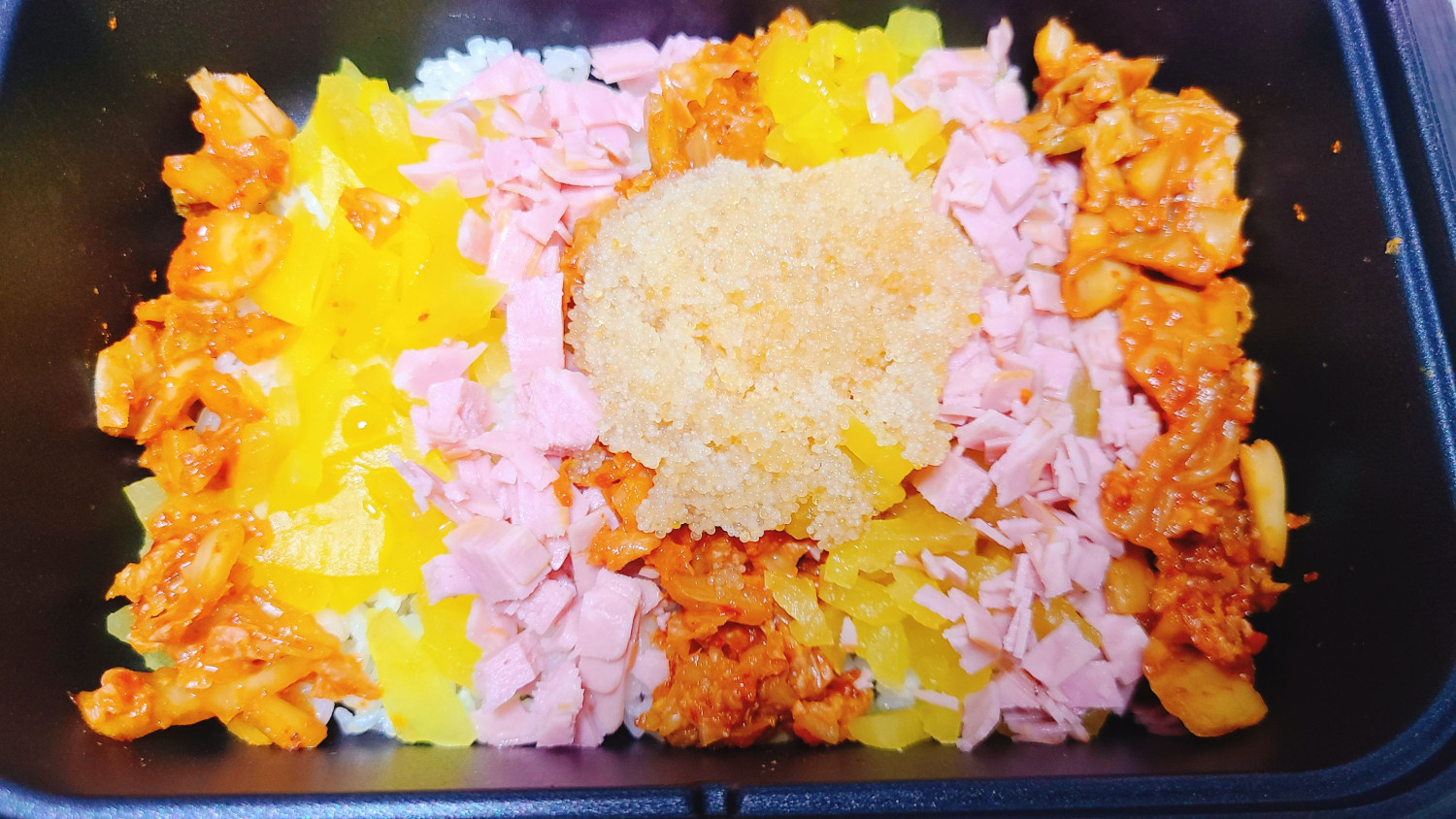 Pique finamente el jamón para sándwich en cubos pequeños, de tamaño similar al kimchi y al rábano. El sabroso y tierno jamón añade una rica y satisfactoria textura a este plato de arroz.