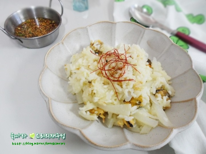 Sirve el Arroz de Mejillones caliente con una generosa cantidad de la salsa de sazonar casera. ¡Mezcla todo y disfruta! Los sabrosos mejillones, el dulce rábano y la picante salsa de chile crean una experiencia increíblemente deliciosa. ¡Te encontrarás terminando este plato en poco tiempo!