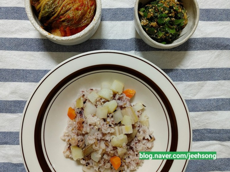 Una vez que el arroz esté cocido, no lo deje reposar. Inmediatamente, esponje suavemente el arroz y las verduras con una espátula, con cuidado de no machacar las verduras. Esto asegura que la textura y el sabor de las verduras de raíz se conserven. Sirva el nutritivo arroz de verduras de raíz y cubra con la salsa de soja preparada. ¡Disfrute de su deliciosa y saludable comida!