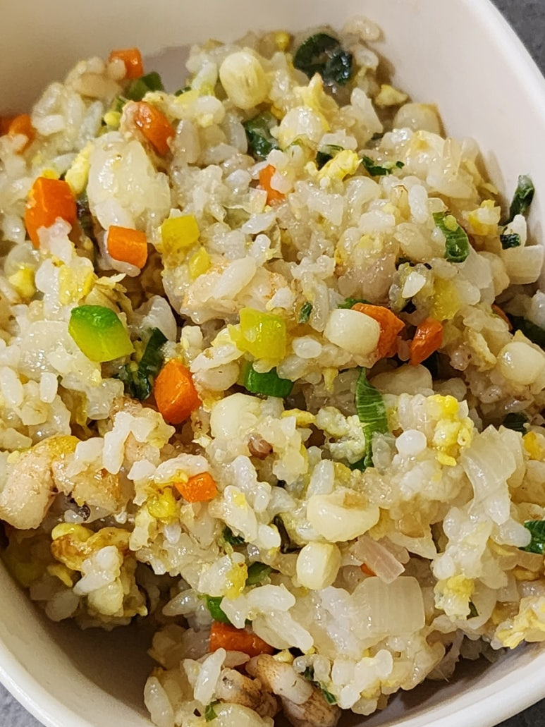 Incorpora los granos de maíz dulce. (¡Si usas maíz fresco, hiérvelo primero y luego corta los granos para un sabor aún mejor!) El maíz añade un color encantador y un toque delicioso al arroz frito.