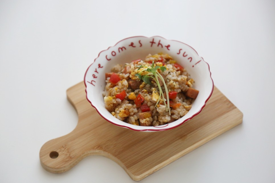 Transfiere el arroz frito terminado a un plato para servir. Para un toque extra, espolvorea con perejil seco. ¡Disfruta de tu deliciosa comida!