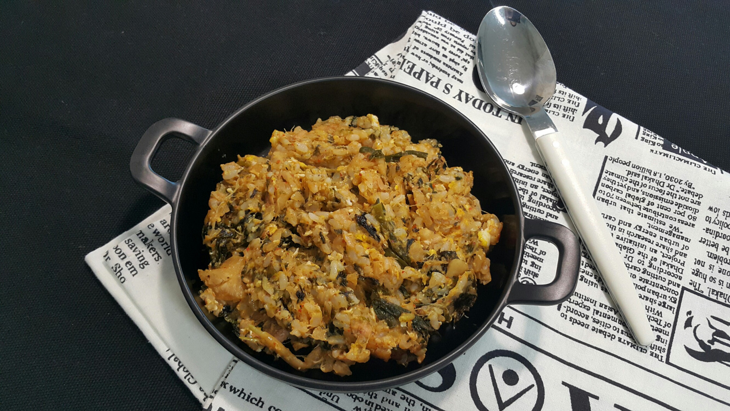 Separe con cuidado las tiernas hojas de perilla (o col) y la carne que aún queda adherida a los huesos de su Gamjatang sobrante. Deseche los huesos. Coloque toda la carne y verduras recuperadas en una sartén ancha o wok. Incluir un poco del caldo de Gamjatang hará que el arroz frito quede más jugoso y sabroso.