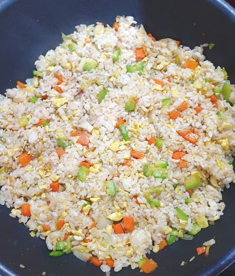 Finalmente, rocía el aceite de sésamo (1/2 cucharada) para añadir fragancia. Agrega los 4 tazones de arroz cocido tibio. Rompe suavemente cualquier grumo de arroz con tu espátula y saltea todo junto durante otros 5 minutos, asegurándote de que el arroz esté uniformemente cubierto con los ingredientes y condimentos. El arroz frito está listo cuando cada grano de arroz tenga un brillo sedoso de la salsa. ¡Disfruta tu delicioso arroz frito de verduras mientras está caliente!