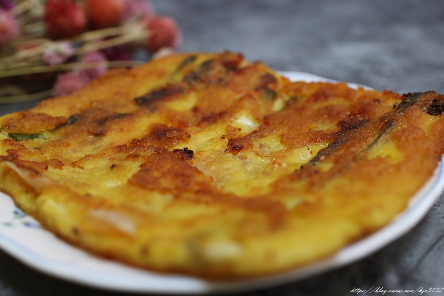 Calienta una sartén ancha a fuego medio-bajo y añade una cantidad generosa de aceite de cocina. Vierte una porción de la masa de judías mungo en la sartén y extiéndela en una forma redonda y plana. Coloca los ingredientes de cobertura preparados (helecho adobado, cebolletas cortadas, kimchi picado) de manera ordenada. Luego, vierte aproximadamente media porción de masa y extiéndela suavemente sobre los ingredientes, como si los cubrieras. Esto ayuda a que los ingredientes de cobertura permanezcan en su lugar.