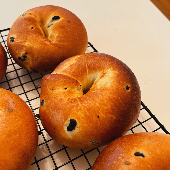 Precalienta tu horno a 210°C (410°F). Hornea los bagels durante 13 minutos, o hasta que estén dorados y tengan una corteza firme. Los tiempos de horneado pueden variar según tu horno.