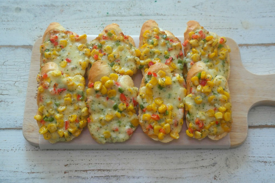 Usando una cuchara, cubra generosamente cada rebanada de baguette con la mezcla de maíz y queso preparada en el paso 2. Asegúrese de rellenar hasta los bordes para que los ingredientes no se caigan al morder.
