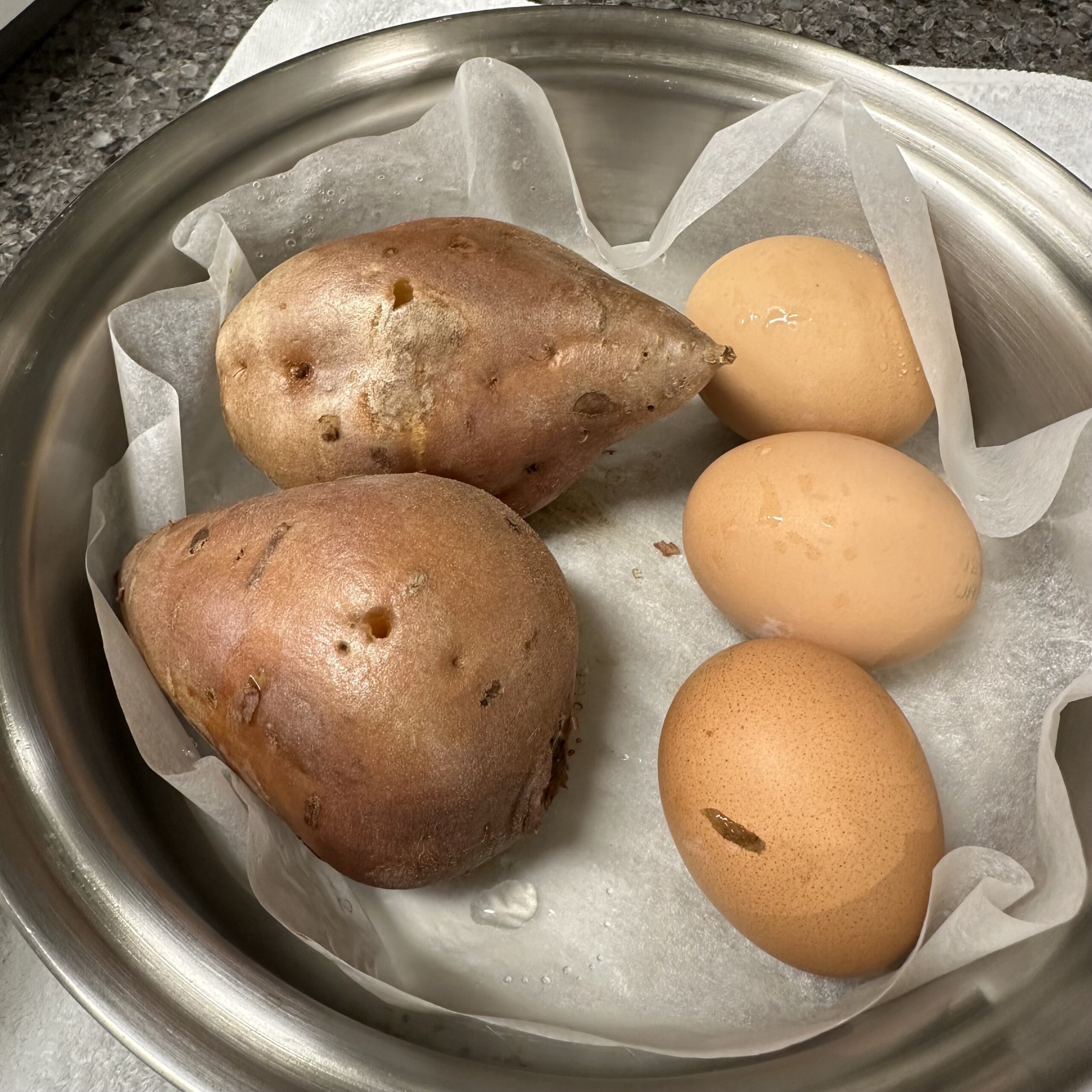 ¡Listo! Después de dos horas, tus batatas asadas calientes y dulces, junto con tus huevos asados perfectos y deliciosos, estarán listos. El dulce aroma de las batatas saliendo de la olla te llenará de felicidad. Las batatas recién asadas son deliciosas incluso con la piel, y los huevos, una vez que se enfrían un poco, se pelan para revelar un interior tierno. Es un bocadillo perfecto y sencillo que toda la familia puede disfrutar junta. ¡Buen provecho! ♥️