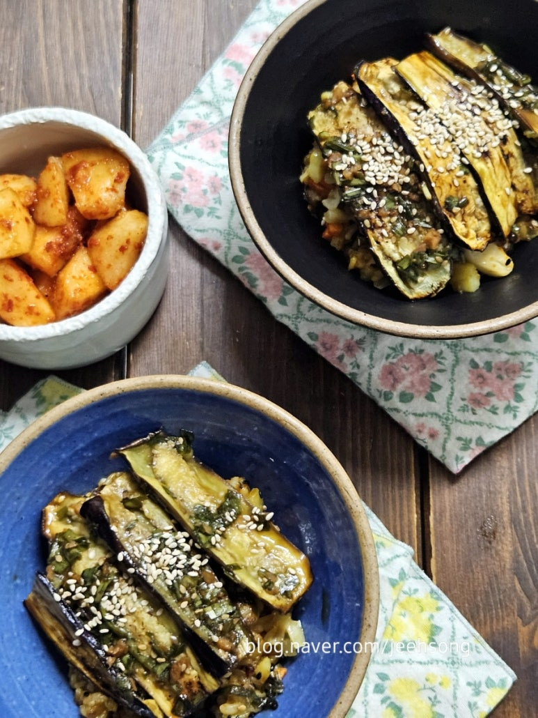 Lava la berenjena, quita los extremos y córtala por la mitad a lo largo. Luego, corta cada mitad en tiras largas y finas. Asa las tiras de berenjena en una sartén seca a fuego medio hasta que estén doradas y tiernas por ambos lados. Asar sin aceite realza la dulzura natural de la berenjena.