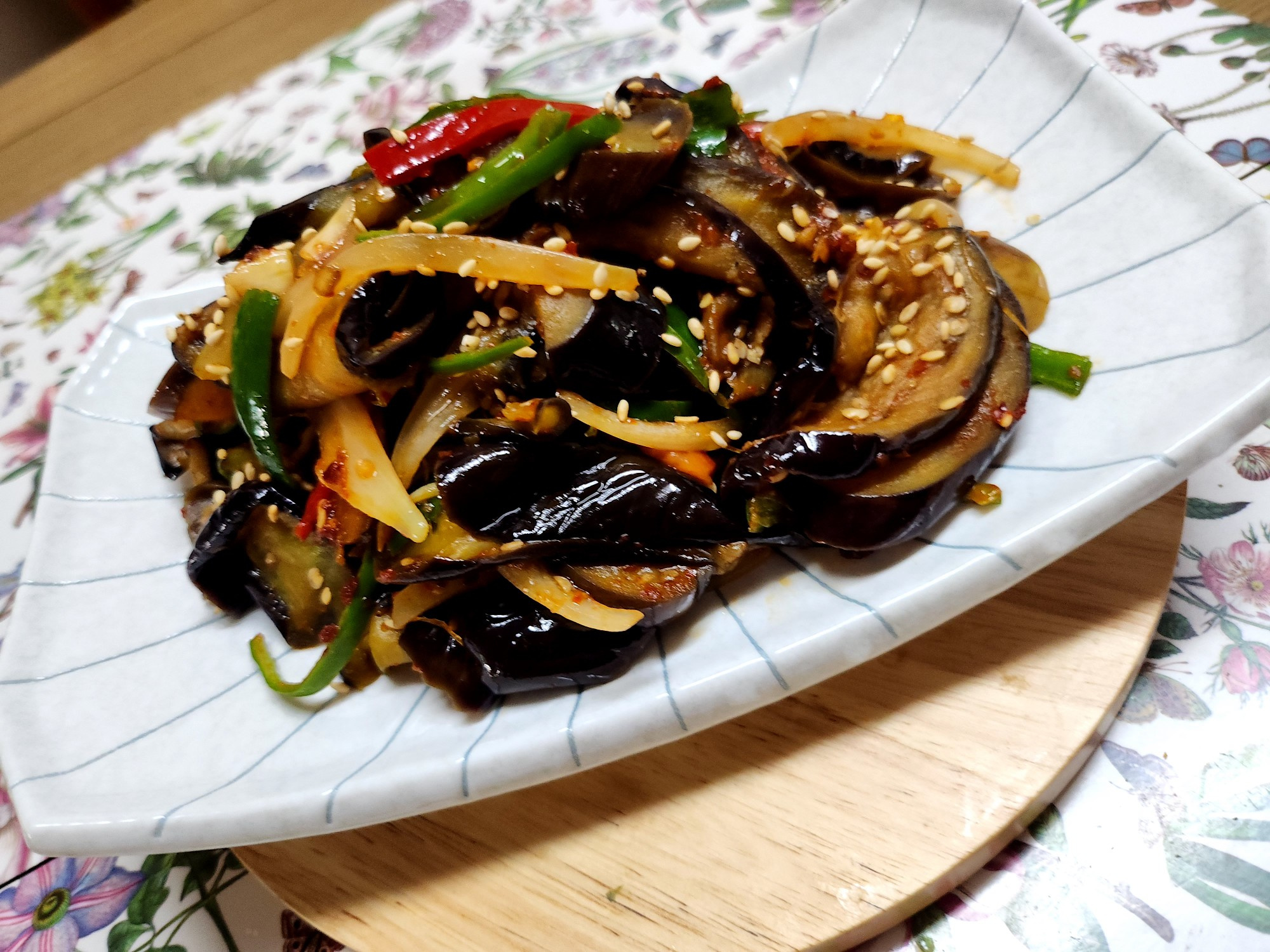 Espolvorea generosamente con semillas de sésamo para terminar. ¡Tu deliciosa y crujiente berenjena salteada estará lista! Disfrútala con un tazón de arroz caliente.