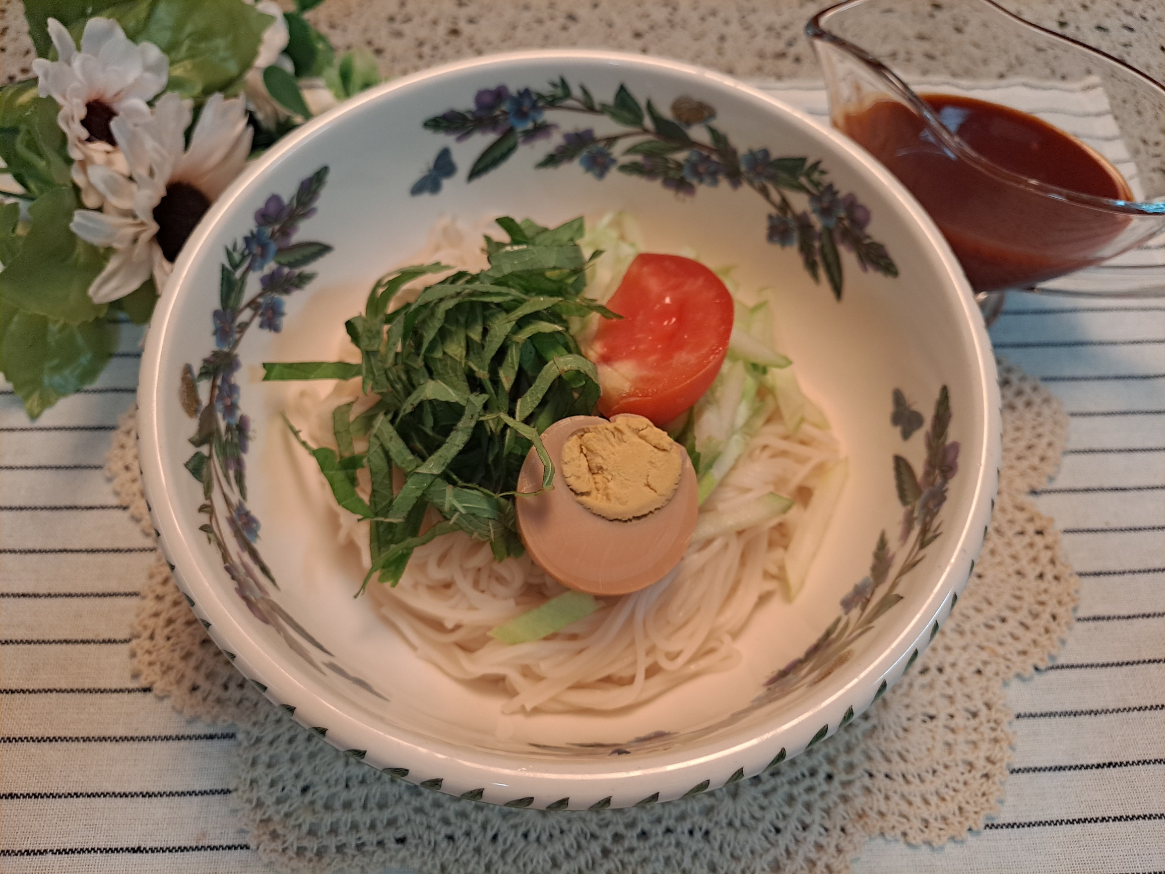 Arme su bibim guksu colocando los fideos escurridos en un tazón para servir. Disponga artísticamente el pepino en juliana, las hojas de perilla en rodajas, el tomate y el huevo duro como aderezos. Finalmente, sirva generosamente la salsa preparada sobre todo. ¡Su sabroso bibim guksu de gochujang está listo! Para un toque extra de riqueza, rocíe unas gotas de aceite de sésamo antes de servir.