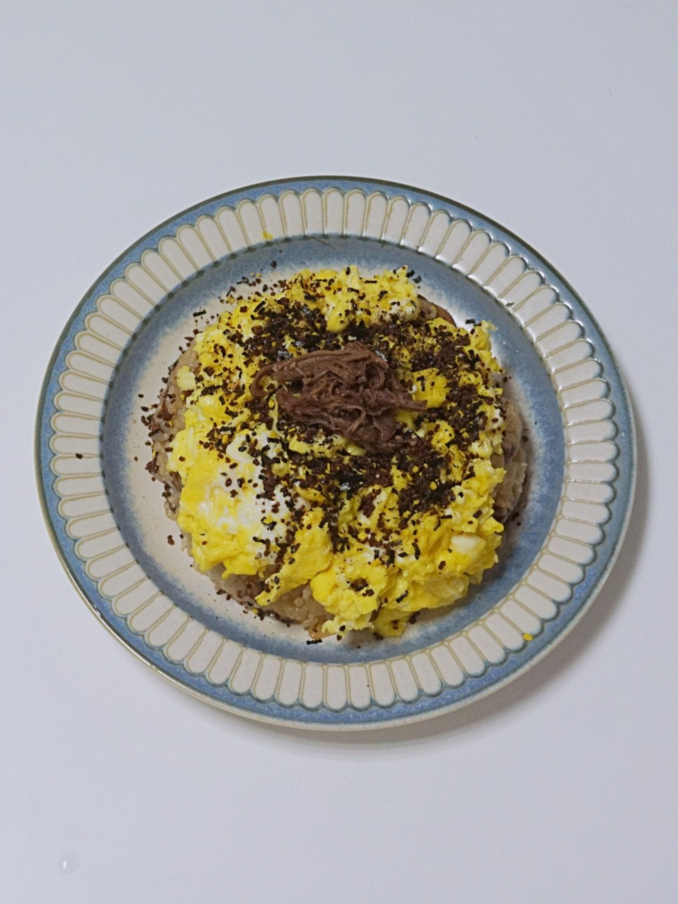 Finalmente, espolvorea un poco de furikake por encima. Usé el sabor Bulgogi de Babchingu de Ottogi, pero estaba un poco salado, así que usar aproximadamente medio paquete podría ser suficiente.