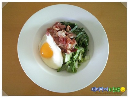 Un plato nutritivo que combina una generosa cantidad de verduras frescas con tocino sabroso y un huevo frito suave. Este bibimbap es rápido y fácil de preparar, lo que lo convierte en una comida satisfactoria incluso en los días ocupados.