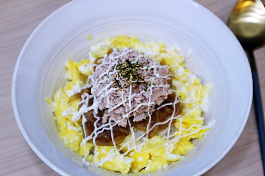 En otra sartén, bate los huevos y haz huevos revueltos. Puedes cocinarlos suavemente o hacerlos más desmenuzables, según tu preferencia. Coloca los huevos revueltos esponjosos sobre un tazón de arroz caliente. Cubre generosamente con las cebollas caramelizadas dulces y saladas, seguido de la cremosa mezcla de atún y mayonesa. ¡Mezcla todo y disfruta de tu fantástico Bol de Arroz con Atún y Mayonesa!