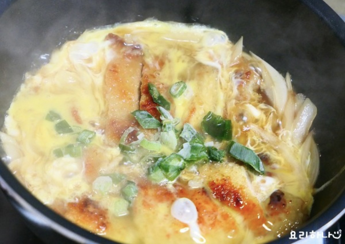¡Ahora es el momento de añadir la mezcla de huevo! Vierta con cuidado los huevos batidos alrededor del lomo de cerdo y las cebollas en la salsa. Tenga cuidado con el fuego para asegurarse de que los huevos se cocinen suavemente y permanezcan tiernos. Finalmente, espolvoree un poco de cebolleta recién picada por encima para darle frescura y color. ¡Su delicioso Katsudon al estilo Baek Jong Won estará casi listo!