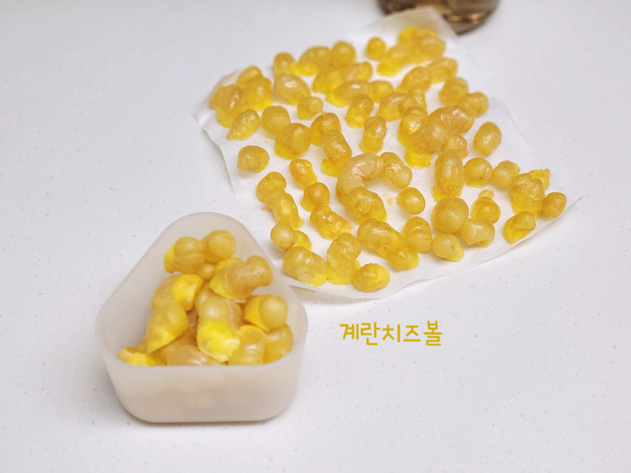 ¡Listo! La primera tanda de bolas de huevo y queso está lista. El queso se ha inflado ligeramente durante la cocción, dándoles una divertida forma parecida a un gusano. ¡Aunque se ven lindas, saben absolutamente deliciosas!